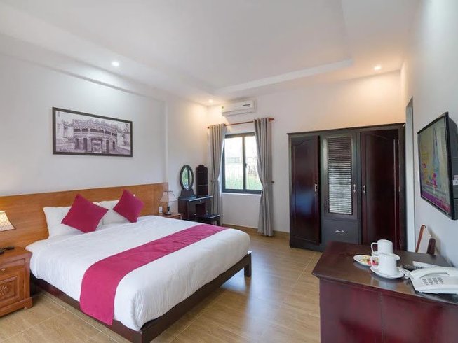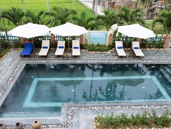 The accommodation has a cool garden, swimming pool, and a peaceful scenery of ripe rice fields just a few minutes' walk to the yoga studio. It is located on Le Thanh Tong Street, close to Ba Le local market, with nearby rice fields. You can walk down or ride a bicycle to admire the field.