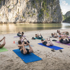After practicing yoga and visiting cultural sites in Hanoi, embark on a luxury cruise in Ha Long Bay. Enjoy a delicious lunch while admiring the stunning rock formations, and take part in activities such as bamboo rowing, swimming, sunset cocktail parties, and cooking classes. Dinner, squid fishing, and relaxation on the cruise.