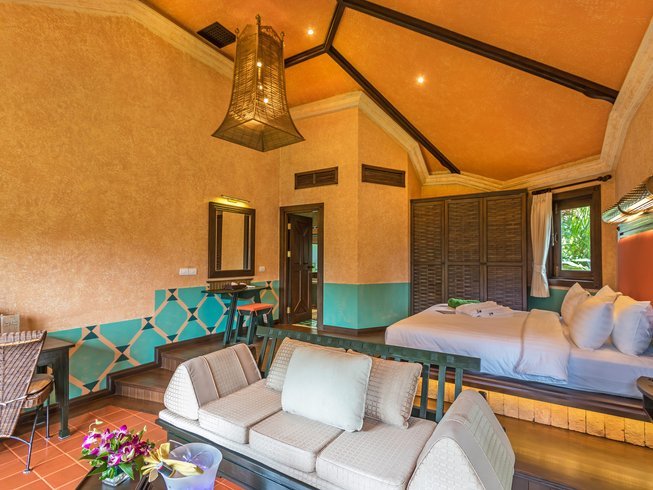 For your retreat, you can choose between the resort's four different rooms types, from the basic Superior Garden Villas (but still 58 square meters) to their most famous Superior Jacuzzi Villas including a Jacuzzi hot tub. All villas lay amidst the lush tropical gardens with the Deluxe Jacuzzi and Royal Jacuzzi Villas having a partial sea view and being the most spacious and luxurious room types. The size of the rooms ranges from 58 square meters to 94 square meters, and provide guests with spacious, large, and private space. Each villa features a comfortable seating area, spacious al-fresco bathrooms with an outside garden rain-shower and a terrace, all designed to ensure an enjoyable stay. The rooms are well fitted out with a variety of unique interior features, designed by John Underwood. Warm tones, rich colors, heavy wooden furniture, and mostly natural materials used and combined to an almost timeless design make you feel comfortable right away. Mangosteen Ayurveda & Wellness Resort's villas have been designed to be naturally cool, with very high insulation and air ventilation through the roof. Even without air-conditioning, you will feel comfortable and relaxed. The air-conditioning is working quietly, the temperature control is precise, and you can reach it from your bed. Mattresses are first grade for a very comfortable sleep and sweet dreams. The tropical gardens are kept natural, cultured but not over-designed, attracting local animals such as geckos, birds, frogs, and butterflies, also a result of environmentally friendly pest control systems.