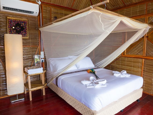 This is a four-night accommodation in a private sea view hut. The retreat also offers one free massage, and daily vegan and vegetarian meals (breakfast, lunch, and dinner).
