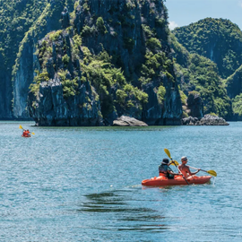 Indulge in a delicious lunch while cruising through the magnificent Ha Long Bay, admiring the stunning rock formations along the way. Take a bamboo rowing boat or kayak excursion to explore Hang Luon cave. Enjoy swimming at Ti Top beach and later, join a sunset cocktail party and cooking class.